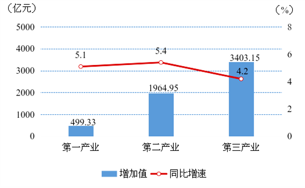 2026年4月23日,贵州省统计局、国家统计局贵州调查总队发布贵州省2026年一季度经济运行情况。根据地区生产总值统一核算结果:一季度全省地区生产总值5867.43亿元,按不变价格计算,同比增长4.7%。其中,第一产业增加值499.33亿元,同比增长5.1%;第二产业增加值1964.95亿元,增长5.4%;第三产业增加值3403.15亿元,增长4.2%。