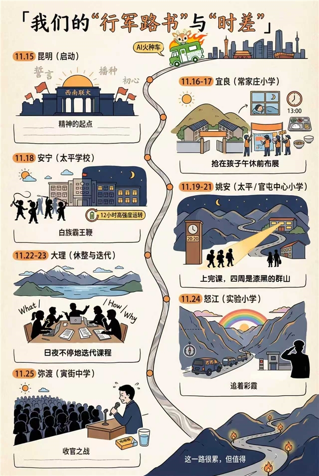 除了线上的资源共享,活动还特别展出了WaytoAGI教育版“AI教育火种车”公益项目的成果。此前,WaytoAGI教育版的9位志愿者老师曾历时11天,深入云南的6所乡村学校。在华为数字包容项目团队的支持下,他们开着“火种车”,将前沿的AI课程带到了大山的褶皱。在本次春晚中,这些偏远地区孩子的作品将与城市学童的作品同台展映。这真正实现了“让AI从远方变成附近”,让每一个孩子无论身处何地,都能平等地感受科技的魅力,拥有以好奇心探索世界的权利。
